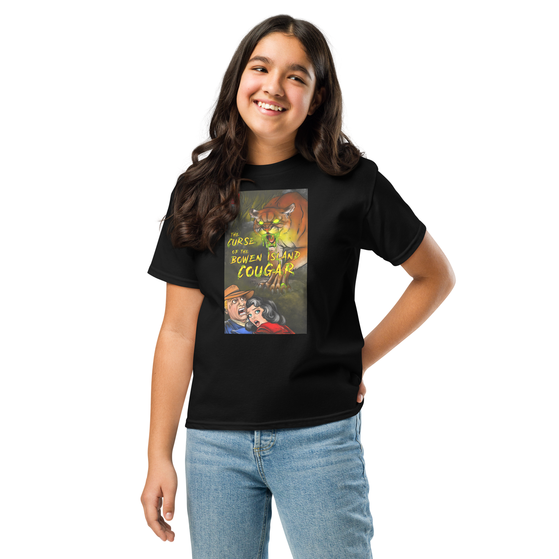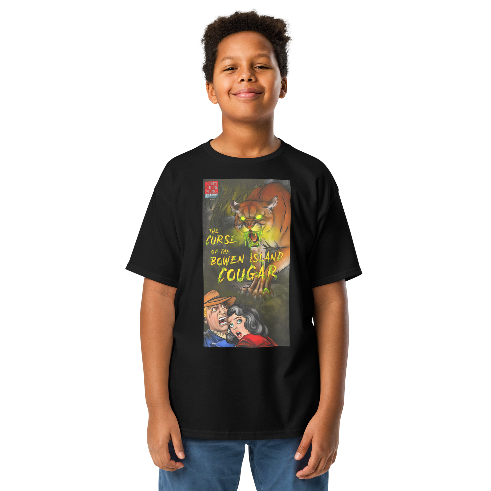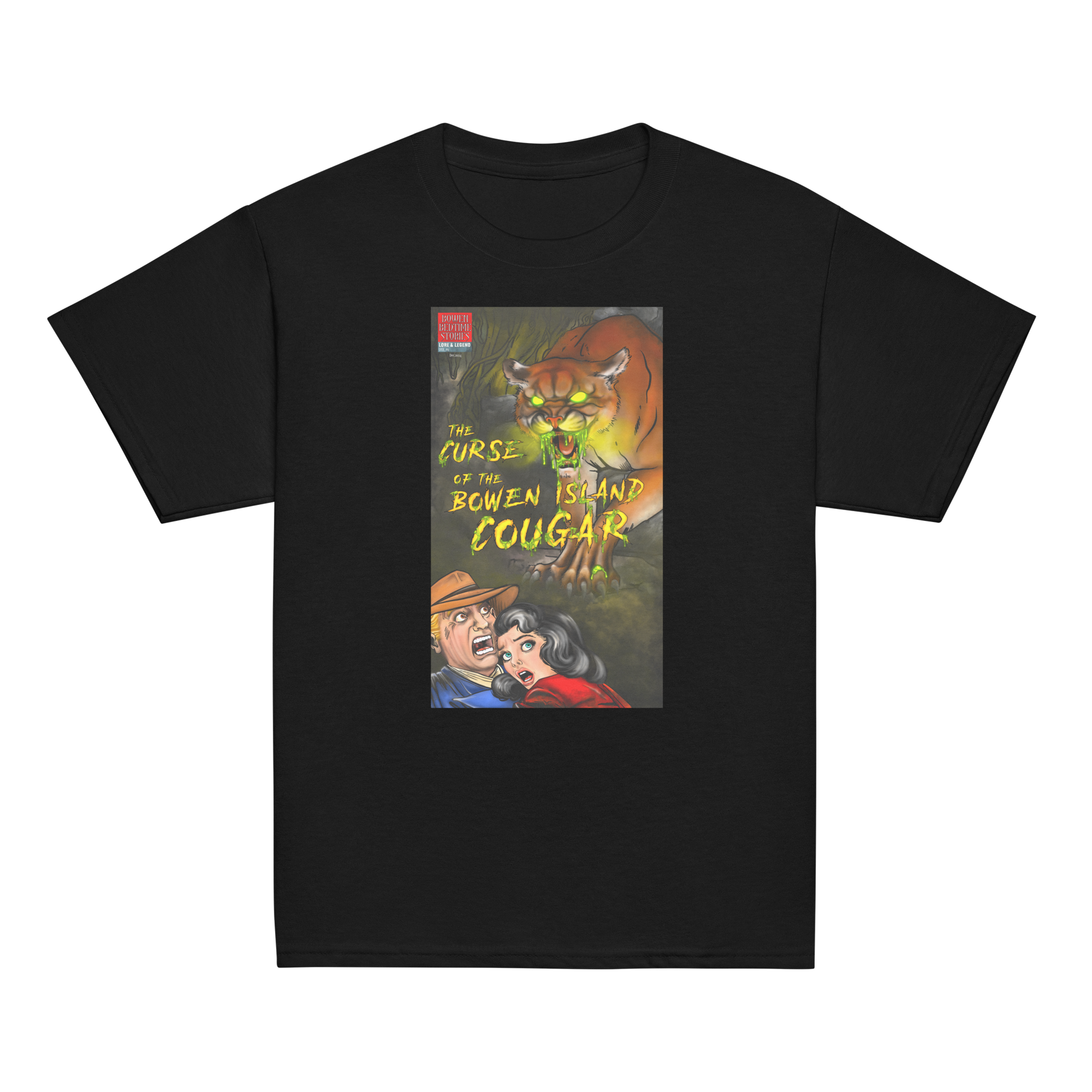 “The Curse of the Bowen Island Cougar” is as unique as the island it comes from. The first in the “Bowen Bedtime Stories - Lore and Legend” series, it is inspired by the widely known cougar currently residing on the island. Reimagined as a 80’s horror comic cover page, the concept was to make light of the highly controversial creature and invoke a sense of communal humour.